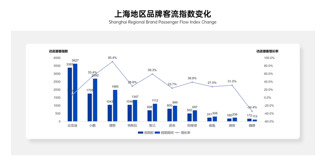 · 除魏牌外,其他9个新能源品牌在国庆假期期间的访店潜客量均表现出正向增长,其中,理想的增长率最高,达到90.4%;
